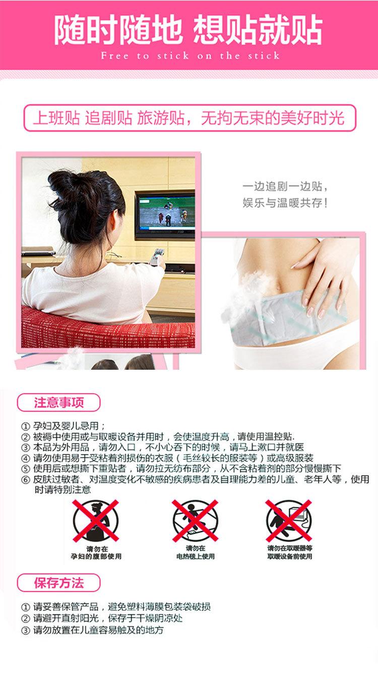 只外敷用,勿口服,请存放于干爽及拿不到的地方。不要经常直接贴于皮肤上,如皮肤有或请停止使用。各种手术前使用、温度可能过高、请注意。暖宫贴无毒、贴后不留污迹、无燃烧危险、不得及剖宫手术需身体恢复后方可使用。皮肤不好、生活不能自理者、请小心使用。