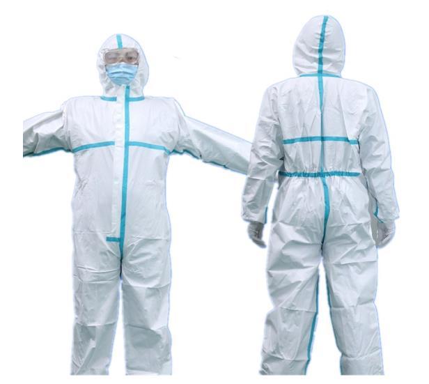 防护服材料有63克,有70克,2层结构,SMS+透气膜防护服的结构应合理,穿脱方便,结合部位严密。袖口、脚踝口采用弹性收口,帽子面部收口及腰部采用弹性收口、拉绳收口或搭扣。