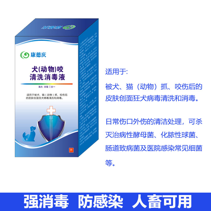 (即犬动物咬伤清洗消毒液)清洗、消毒二合一,适用于被犬、猫等宠物抓咬伤后的皮肤创面狂犬病毒的清洗和消毒,使用方便。