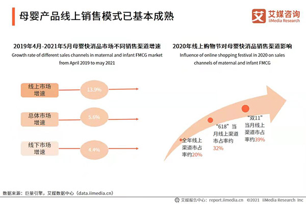 按数据显示,在2020年的6月和11月,受“6.18”和“双11”的影响,母婴快消品的线上渠道销售额市占率分别从20%提升至32%和39%。