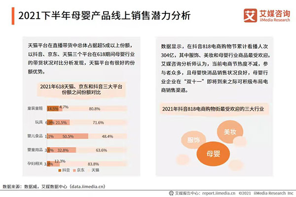 近一年来母婴快消品线上市场的增速为13.9%,在2021抖音818电商购物节中,母婴商品是直播带货的三大受欢迎商品之一,母婴消费品线上渠道的优势明显。