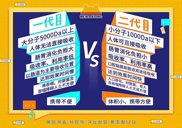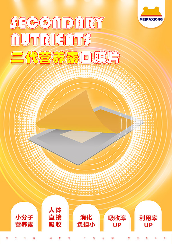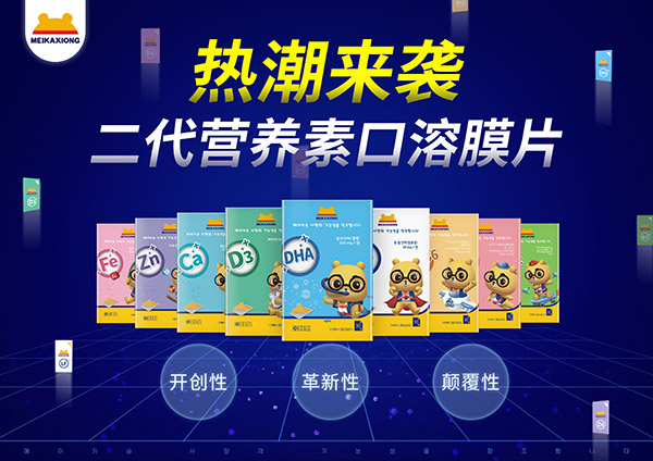 美卡熊二代营养素口膜片,创新性的将二代营养素与独特口溶膜剂型相结合,成为当下营养品市场的新热潮。突破传统胃肠吸收路径,以小于800Da小分子薄膜技术通过口腔“快速崩解”与吸收的二代营养素口膜片,是开创性、革新性、颠覆性的营养品新高度。