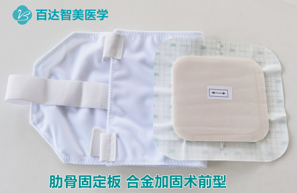 百达智美医学品牌肋骨固定板合金加固型系列产品,主要由玻璃纤维、聚酯纤维等高分子材料、记忆铝合金、低敏自粘胶、离型纸、非织造布、外固定粘合层、多头胸背部肋骨固定带、魔术贴等多种材料制造而成,产品非无菌提供,不与体内使用的医疗器械连接,即开即用、操作简单,随手塑形,刚性适中固定胸廓。