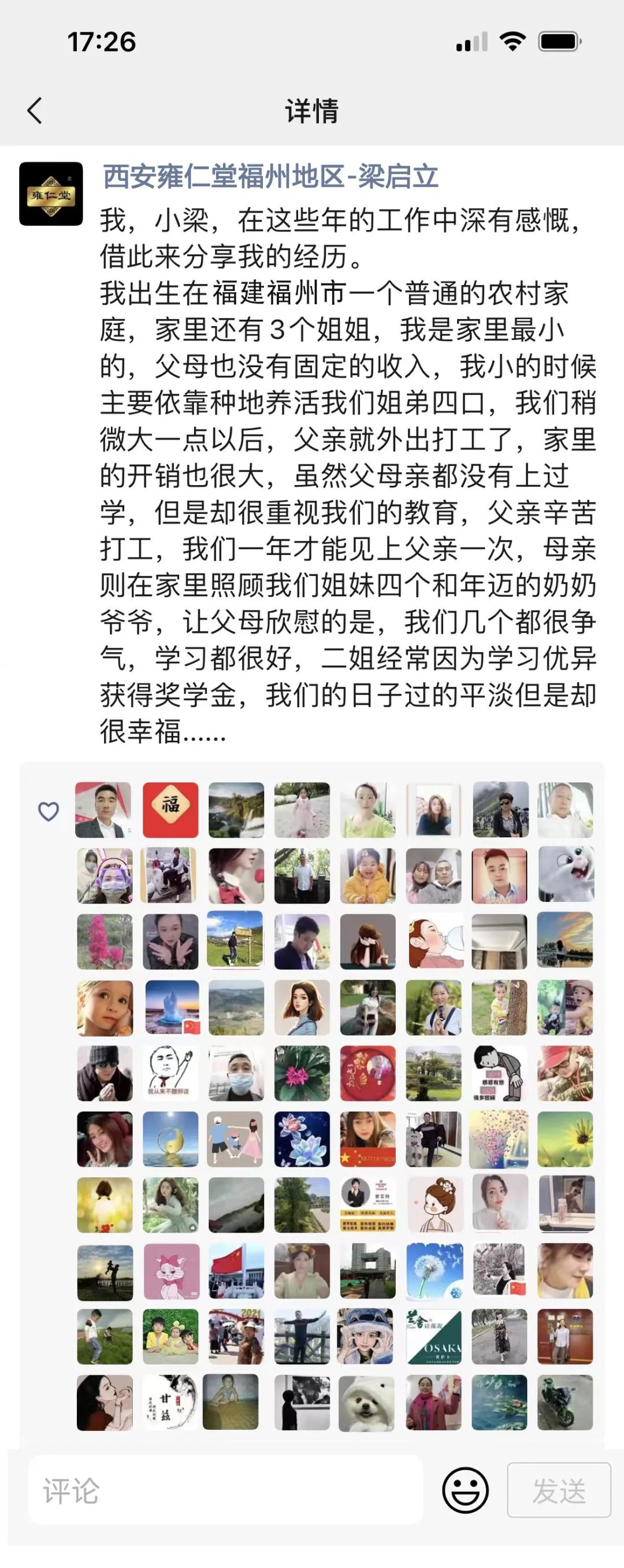 才开始的半年,我和很多的创业人一样,每天起来的很早,晚上很晚才到住的地方,白天也是饥一顿饱一顿,由于刚开始也没有掌握好很多的销售技巧,也遭受到客户的白眼,甚至赶出来,业绩一直也不是很好,但是我身上就是有股不服输的劲,每天晚上我学习产品知识,整理产品,学习很多销售知识,就这样我慢慢的熬出来了,从零开始现在慢慢的客户也多了起来,从白眼到主动打电话要产品,建立起了自己的客户网,没人知道我付出了多少努力,我不满足于现状,决定自己干,我做了福州市的区域代理,赚的比之前更多了,我也更有动力了,短短一年时间我把父亲生病欠下的外债都还完了,第二年我又赚钱买了车子,方便我更好的跑业务,现在是加入雍仁堂的第4年,越做越轻松,积攒了很多老客户,家里的房子也重新盖了,爸爸妈妈也可以没有负担的安享晚年了,现在回想起来感觉所有的付出都是值得的,所有的困难都不是问题。