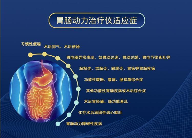 3、胃肠动力治疗仪是采用高科技智能生物音频技术、数字合成技术,生成特定胃肠生物起搏电信号,对胃肠起搏点进行刺激起搏,结合专用耗材,纠正异常胃肠电节律,抑制异位起搏点的电活动,来治疗各种功能性胃肠疾患的设备。