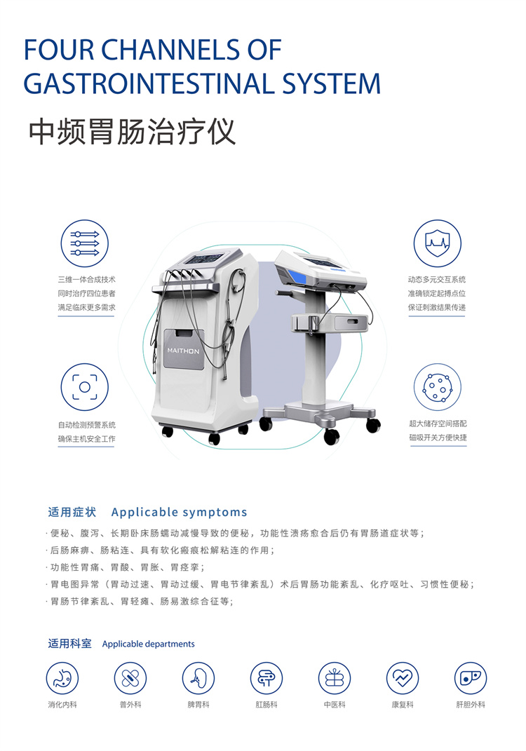 胃肠动力治疗仪治疗各种功能性胃肠疾病(即非器质性病变)临床应用非常广泛,技术门槛高,效果理想确切,弥补了胃肠道疾病治疗的市场空白,临床上治疗胃肠道疾病基本上都是药物治疗,没有设备治疗,而且单纯的药物无法解决心理部题,音乐调节心理方面有非常显著的效果,药物刺激、长期卧床不运动、情绪方面引起的胃肠功能紊乱都可以用胃肠动力治疗仪做治疗。