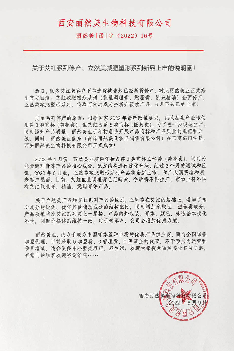2022年4月份,丽然美业获得化妆品第3类商标立然美(美妆类),同时将能量调理膏等产品的核心成分、配方结构进行优化升级。经过2个月的测试和验证,2022年6月底,立然美减肥塑形系列产品将全新上市,和广大消费者和新老客户见面。目前,艾虹能量调理膏已经断货,今后将不再生产,市场上将不再有艾虹能量膏、精油、燃脂膏等产品。