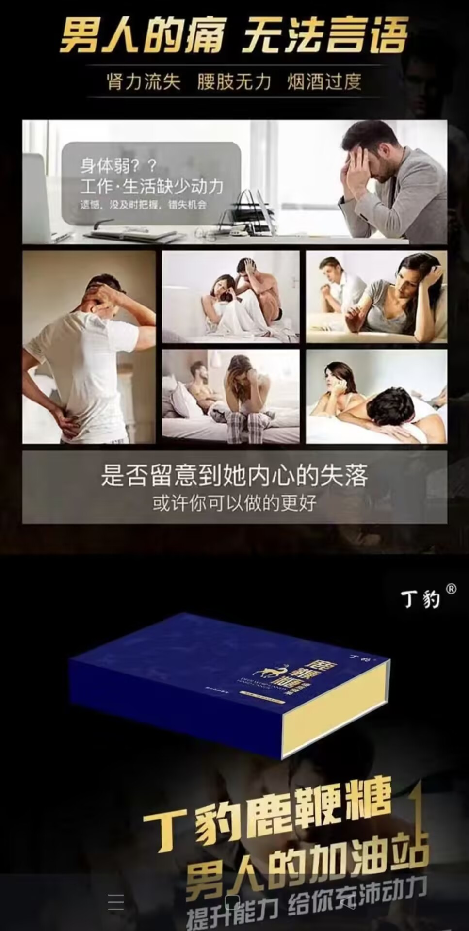 你在犹犹豫豫要不要买,你不知道隔壁老王已经捷足先登买完了么?你总以为你不需要,你真的只用不保养么?你觉得你厉害,你真的没有力不从心得时候么?【丁豹鹿鞭糖】保养滋补,趁你年轻趁你还有资本,身体是你的,面子是你的,你不牛逼,有人替你牛逼。【丁豹鹿鞭糖】纯中药成分提取没有添加无任何副作用,一天一粒使用方便见效快速,让你幸福健康每一天!【丁豹鹿鞭糖】是一款针对健康研发的保健品,它是一款药食同源的纯天然成分产品,一款纯植物配方提取,具有高浓缩肽分子,可以快速直达体内修复受损机能。调节亚健康,辅助受损机体快速恢复健康。安全绿色天然,0激素!并已通过人民共和国食品和监督管理局GMP认证,及质量技术监督管理局SC认证。可以放心使用。可以长期作为日常补品、食疗服用。