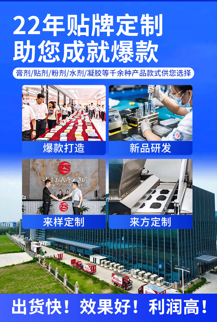 支持小批量定制(械字号膏药5000贴起订)与大宗代工无缝切换,通过规模化采购降低原料成本15%-20%。例如,冷敷贴单价低至0.6元/片(1万盒起订),5万片以上可降至0.8元/片,终端售价较同类产品低10%-15%,为合作品牌提供高性价比方案。