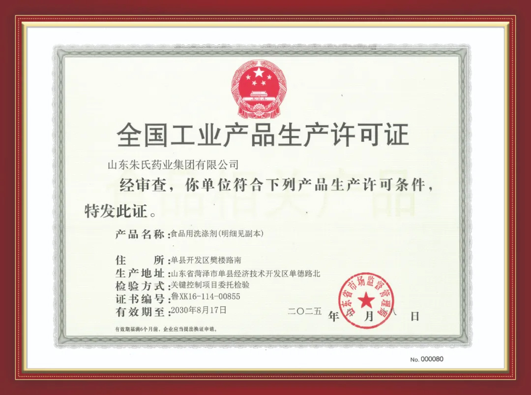 食品用洗涤剂生产许可证由国家市场监管部门颁发,是对企业生产能力、质量管理体系、产品安全性的综合认证。获证意味着朱氏药业的生产环境达到GMP标准,质量管理体系符合《食品安全国家标准 洗涤剂》(GB 14930.1)等法规要求,产品安全性和有效性获得官方认可。
