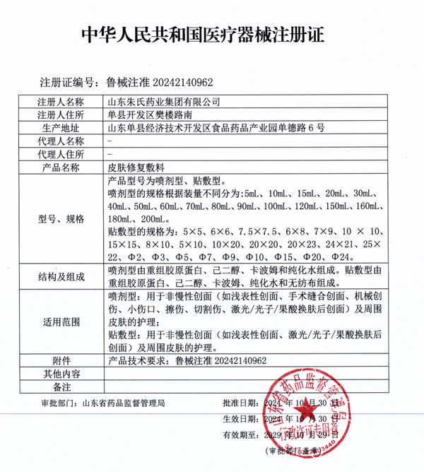 山东康民药业科技有限公司皮肤修复敷料(如鲁械注准20242140692)成功获取二类医疗器械注册证,标志着其在皮肤医疗领域的技术突破与市场竞争力显著提升,具体体现在以下方面: