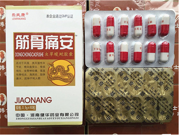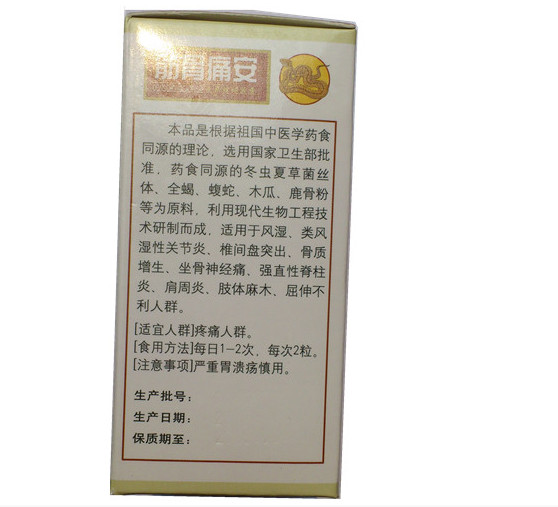 筋骨痛安是根据祖国中医学药食同源的理论,选用国家卫生部批准药食同源的冬虫草菌丝体、全蝎、鹿筋、蝮蛇、拟黑多刺蚁、木瓜灵芝、牡蛎、甘草等为原料,利用现代生物工程技术研制而成,