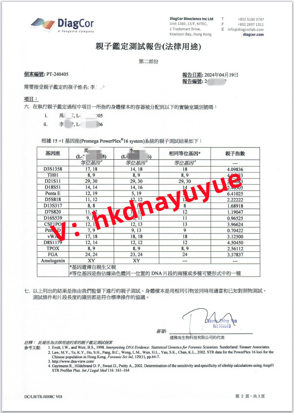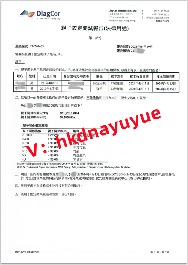 达雅高(DiagCor)化验所检测出具的具备法效的DNA亲子鉴定报告单。